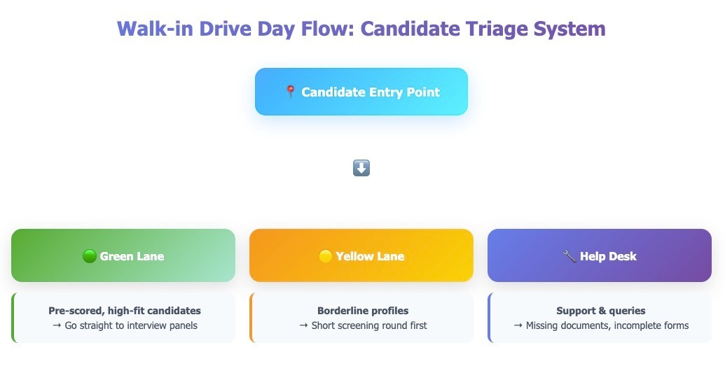 Think of your drive like a channel with lanes. High-fit candidates should move directly to interviews, while borderline profiles go through a quick screening. A help desk can manage incomplete applications or queries. Adding role plays, live dashboards, and digital scheduling keeps the flow smooth and avoids bottlenecks.