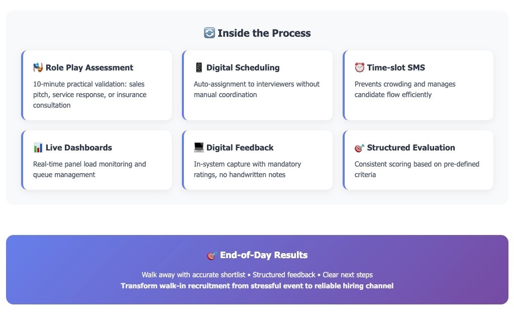 By the end of the day, you leave with an accurate shortlist, structured feedback, and clear next steps — instead of a pile of forms that need days of cleanup. That speed is what turns walk-in recruitment from a stressful event into a reliable hiring channel.