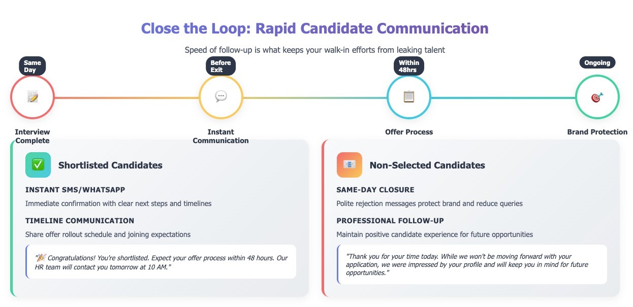 Shortlisting is only half the battle. If you wait days to communicate outcomes, the best candidates may vanish — especially in high-volume roles where multiple offers are common. Speed of follow-up is what keeps your walk-in efforts from leaking talent.