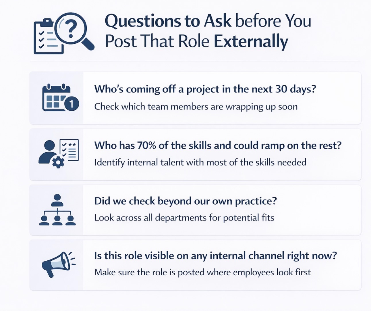 Flip the sequence. Give internal talent a 48-72 hour head start on new openings. Post roles on internal channels, flag them in team meetings, and notify consultants who are ramping down from current projects. This isn't about slowing down hiring. It's about checking your own bench before paying someone else to find what you already have.